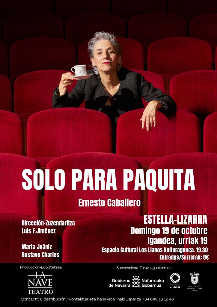 La actriz estellica Marta Juániz, bajo la dirección de Luis F. Jiménez, presenta el próximo domingo 19 de octubre (19.30 horas), en el Espacio Cultural Los Llanos, ‘Solo para Paquita’. En este espectáculo da vida a Paquita, una mujer como tantas otras, sin una vida particular, funcionaria en un Ministerio. La rutina cotidiana y el aburrimiento la conducen a una sala de bingo con el deseo de buscar la suerte y provocar el cambio.