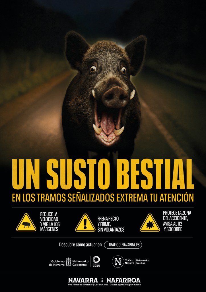 El Gobierno de Navarra, a través del Servicio de Tráfico Navarra, ha lanzado la campaña ‘Un susto bestial’ con el objetivo de sensibilizar a la ciudadanía y reducir los siniestros con presencia de animales en las carreteras navarras. El Ejecutivo foral informará con folletos, carteles y piezas para radio y televisión sobre pautas a la hora de atravesar zonas señalizadas con presencia de fauna salvaje. El año pasado, en vías interurbanas, se registraron un total de 1.005 accidentes por esta causa, el 71,44% con jabalíes y corzos.