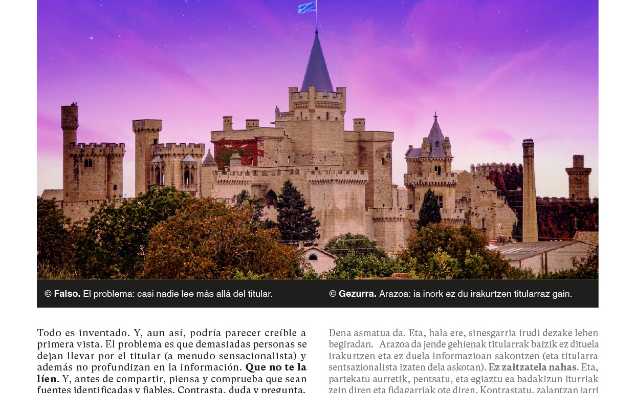 La campaña arranca esta semana con estos dos primeros impactos y continuará en los próximos días con otras noticias ficticias locales, con las que el Ejecutivo foral quiere poner en evidencia el riesgo de acabar creyendo un bulo si no se contrastan fuentes o se hace una lectura superficial de las informaciones.