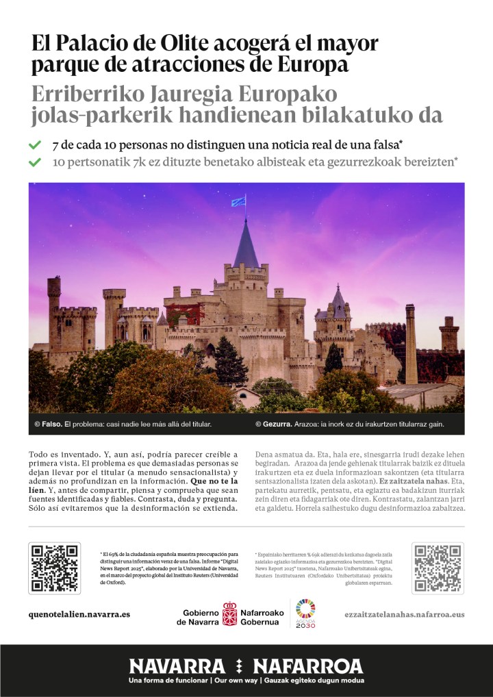 La noticia de que el Palacio de Olite acogerá el mayor parque de atracciones de Europa o el anuncio de obras en la Plaza del Castillo para construir la primera estación de metro. Son dos de las ‘fake news’ forales elegidas por el Gobierno de Navarra para lanzar una campaña en defensa de la información veraz y plural, a la vista de que 7 de cada 10 personas declaran tener dificultades para distinguir una noticia real de una falsa. ‘Que no te la líen’ es la idea fuerza que se repite en los materiales gráficos y audiovisuales creados.