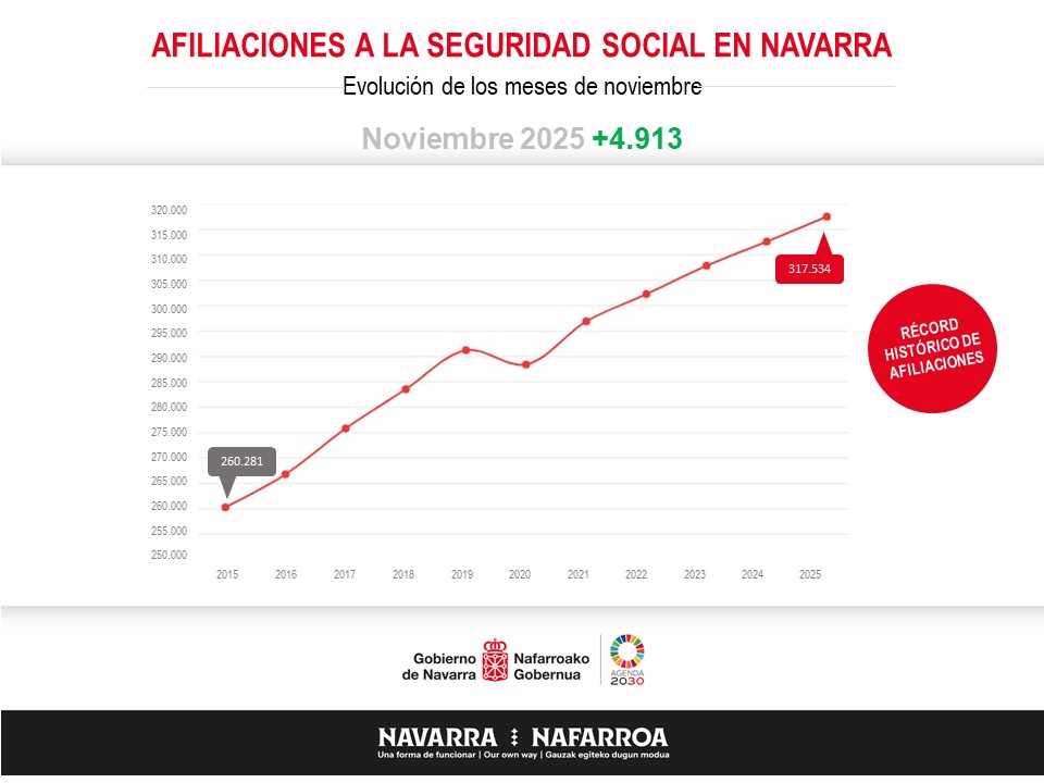 a Comunidad Foral ha vuelto a registrar un nuevo récord de personas trabajando, la afiliación media vuelve a crecer en Navarra. La variación intermensual ha supuesto un +0,12% más de afiliaciones (382 afiliaciones más en un mes) y con 317.534 afiliaciones se vuelve a alcanzar la cota máxima histórica de empleo por segundo mes consecutivo. Se ha dado un crecimiento anual de 4.913 afiliaciones (un +1,57%).