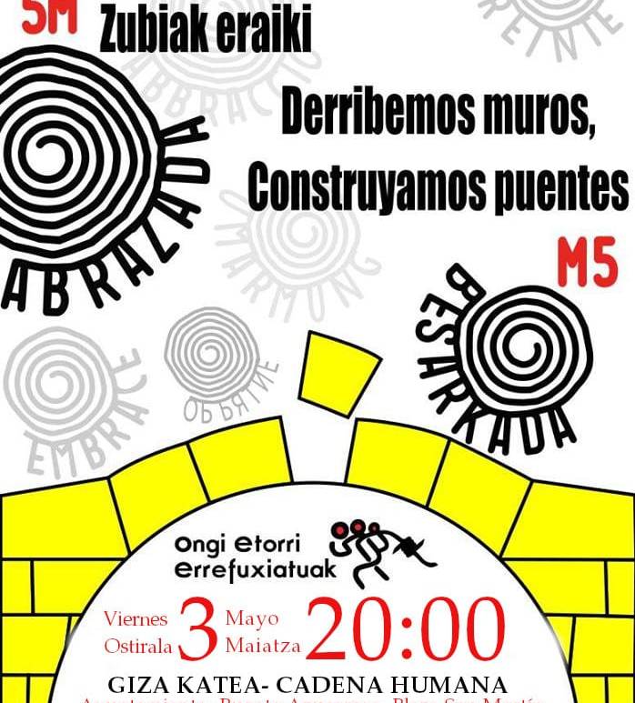 EL VIERNES 3 DE MAYO A LAS 20.00 tendrá lugar una cadena humana y posterior abrazada popular. Será un acto simbólico representando la solidaridad y la acogida de todas las personas con una cadena humana y abrazada popular que unirá el Ayuntamiento de Lizarra con la Plaza San Martín, pasando por el puente del Azucarero. Representará la unión y el abrazo de los pueblos, de … Continúa leyendo Estella-Lizarra ciudad de acogida organiza una cadena humana y abrazada popular