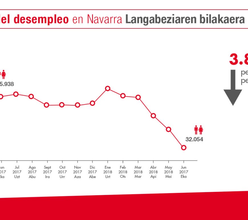 Navarra, la comunidad autónoma en la que más desciende el paro en el último año, un 10,81%, y la cuarta que más empleo crea     El paro en Navarra consolida su trayectoria descendente al contabilizar el mejor dato registrado en un mes de julio desde antes de la crisis económica, con un descenso de 1.282 personas, lo que supone un descenso de 3,82% … Continúa leyendo El mejor mes de junio para el empleo desde antes de la crisis: desciende el paro en Navarra 1.282 personas