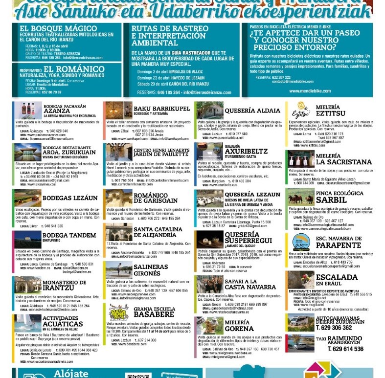 ASOCIACIÓN TIERRAS DE IRANZU-KO LURRAK Al abrigo de la Sierra de Ubasa y Andia La Asociación Tierras de Iranzu, presenta su proyecto “Ecoexperiencias Semana Santa y Primavera en Tierras de Iranzu” para este año 2023. Una gran oferta de Turismo activo, Cultural, Enoturismo y Turismo Gastronómico. Todas nuestras propuestas han sido rediseñadas, y adaptadas para configurar un producto singular, diferenciado y con gran capacidad de … Continúa leyendo ECOEXPERIENCIAS SEMANA SANTA Y PRIMAVERA EN TIERRAS DE IRANZU 2023